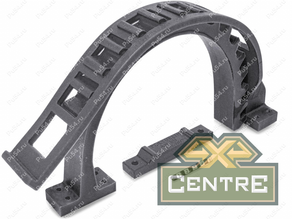 Зажим крепежный из прочного, износостойкого полиуретана. Конструктивно состоит из трех элементов, каждый из которых крепится на поверхность по-отдельности на нужном расстоянии: ремень с прорезями, ребристая часть, площадка опорная.