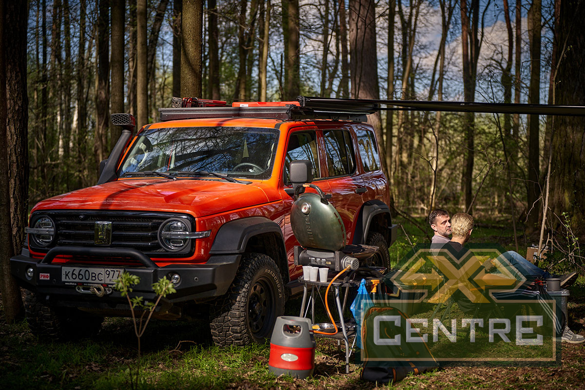 Жестко крепится к кузову автомобиля или автомобильному багажнику, удобно и быстро разворачивается в походное положение.