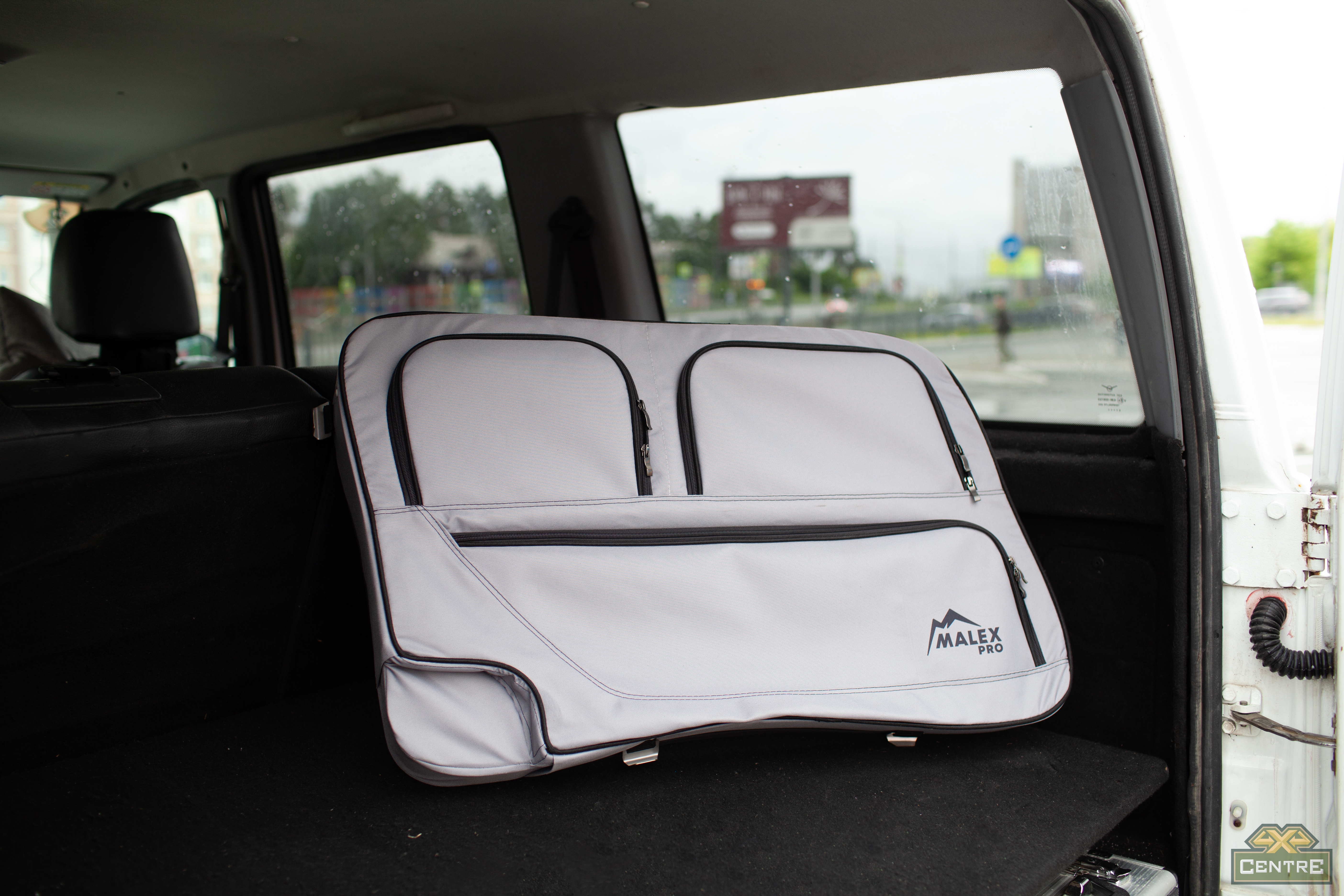 Сумка-органайзер устанавливается в проём бокового окна багажника. Заполняет весь проём бокового окна. Так же имеет вырез под спинку заднего сиденья – продуман до мелочей.