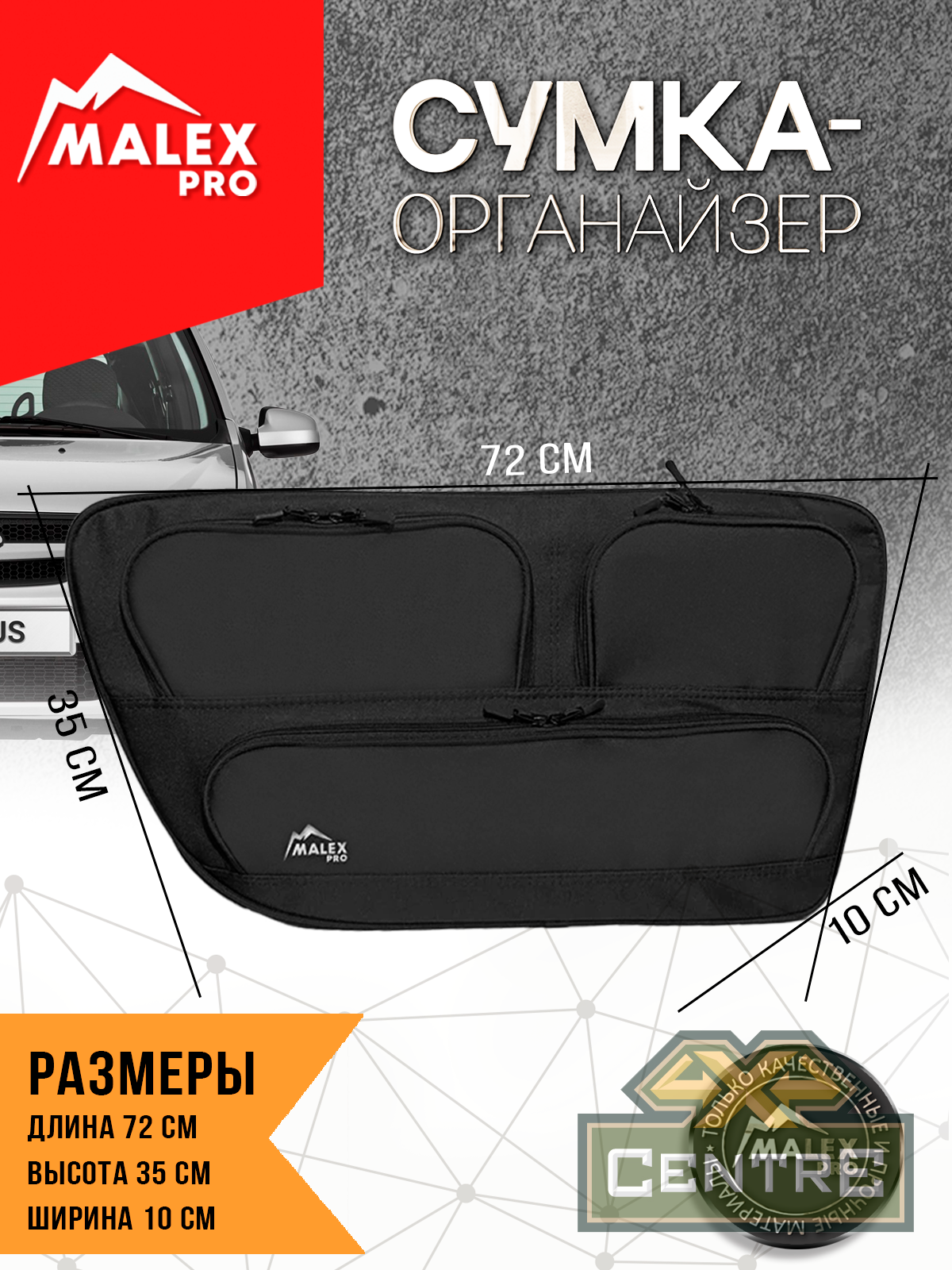 1. Сумка-органайзер устанавливается в проём бокового окна багажника. Заполняет весь проём бокового окна;