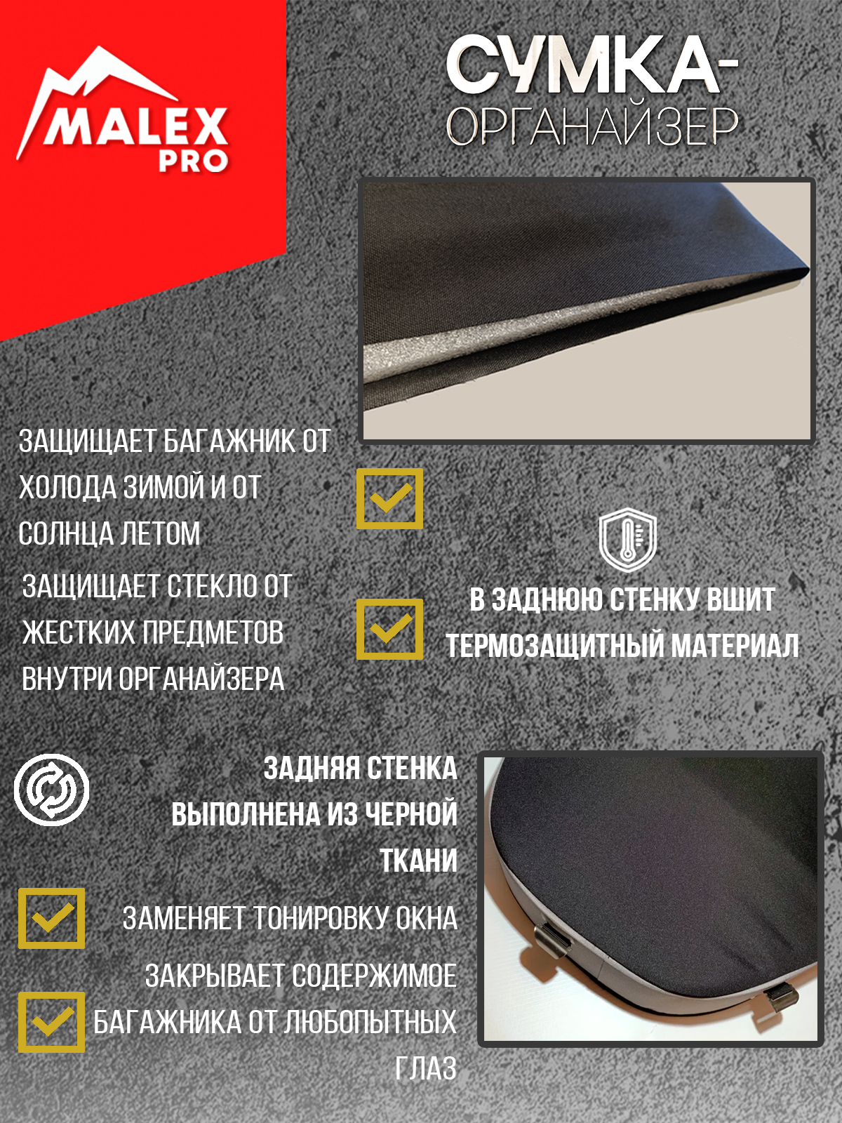 - Органайзер защищает багажник от холодного излучения зимой, и лучей солнца летом. Внутри задней стенки органайзера вшит фольгированный утеплитель;