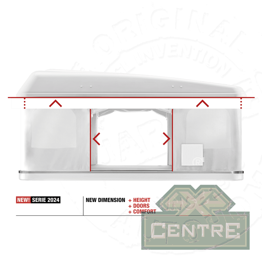 В открытом состоянии внутренний объём палатки очень большой. В палатке Maggiolina Grand Tour 360 все рассчитано так, чтобы человек среднего роста (170-190 см) мог удобно сидеть, не сгибаясь. А длина палатки 215 см позволяет удобно расположится на матрасе в полный рост. Ширина двери палатки 90 см, шире чем у других Maggiolina (75 см) для более широкого обзора и для более удобного доступа.