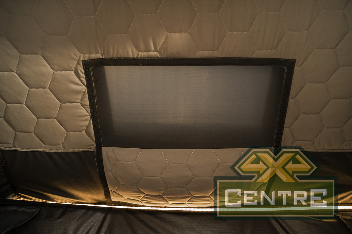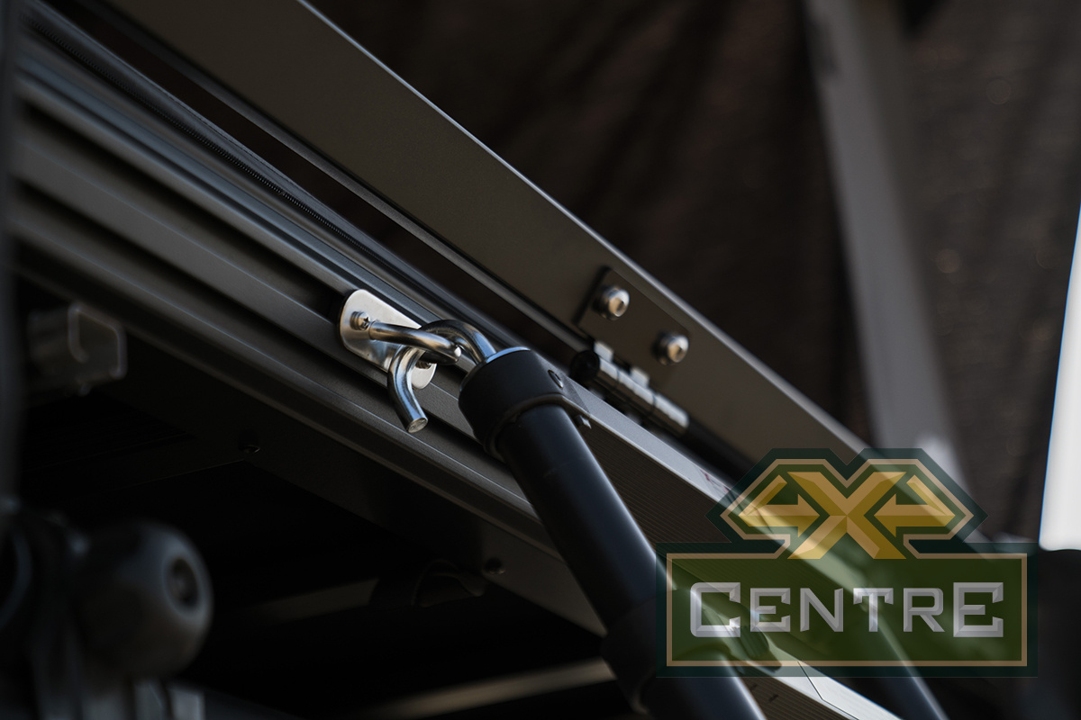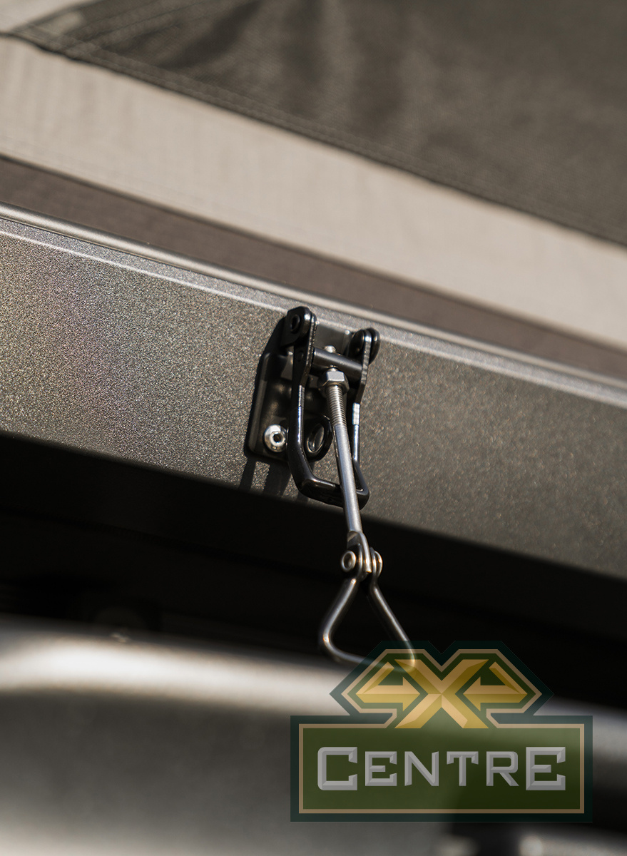 Отличие от предыдущей версии палатки - стильный песолчный цвет ткани палатки, дополненный инструментальный комплект для монтажа и модифицированные крепления палатки к автомобилю.