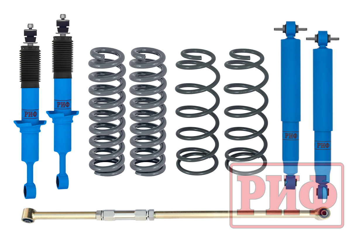 Все компоненты лифт-комплектов РИФ разработаны специально для эксплуатации внедорожника в тяжелых условиях на различных дорожных покрытиях. Амортизаторы с технологией R-AIR и пружины РИФ не только компенсируют вес установленного на внедорожнике дополнительного оборудования (бамперов, порогов, дополнительных топливных баков, лебедок и прочего), но также существенно повышают грузоподъемность автомобиля.