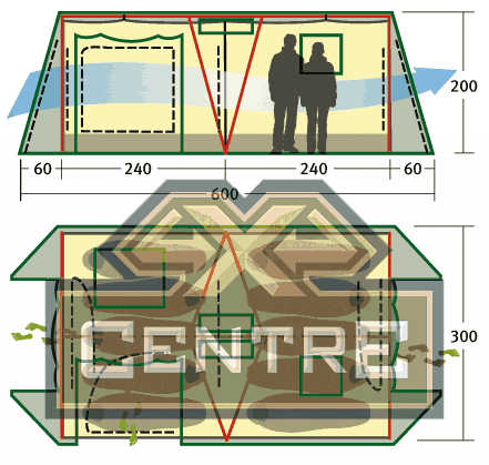 - Эффективная система вентиляции состоит из трёх вентиляционных окон с антимоскитными сетками и внешними шторками на молнии, расположенных по периметру палатки.