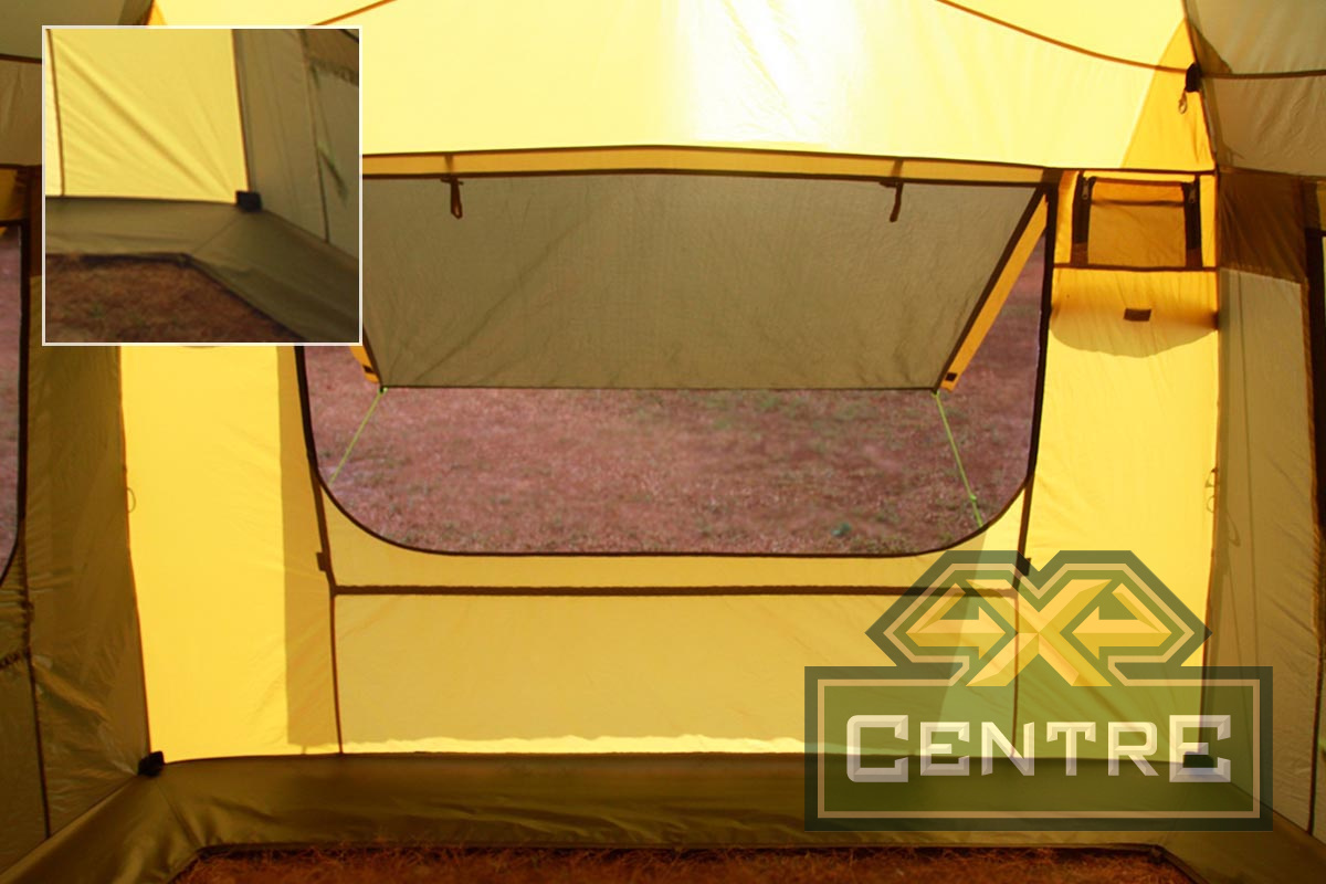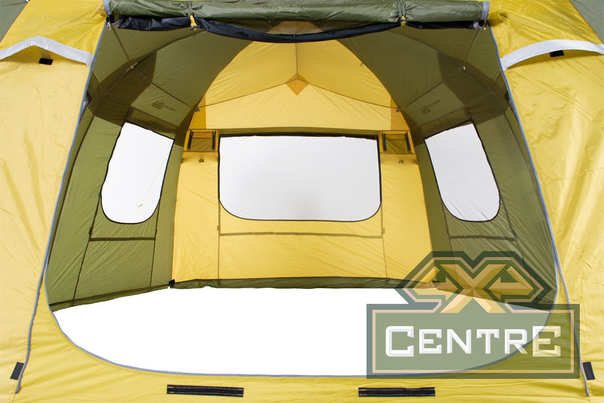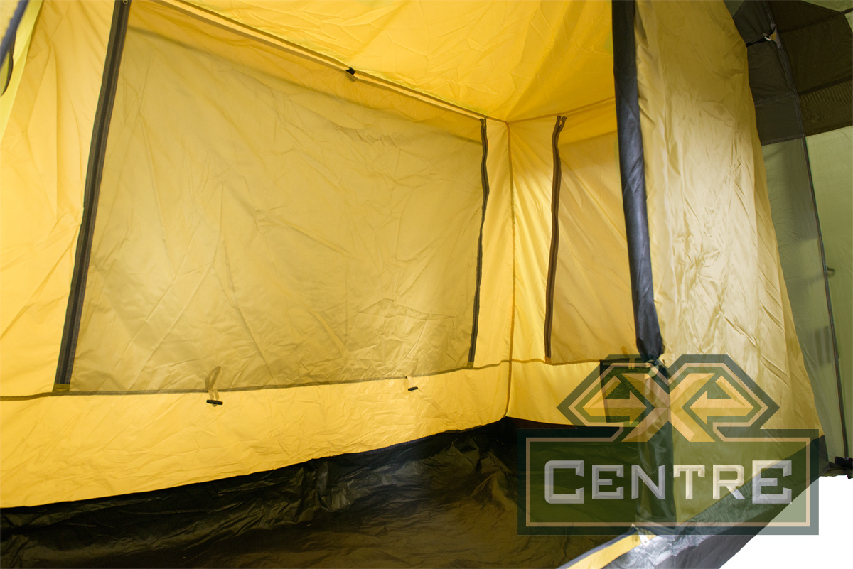 Внутренняя палатка имеет три больших окна, защищенных противомоскитной сеткой, которая продублирована ветро/водозащитными шторками на застежках «молния». Они расположены напротив окон внешнего тента.