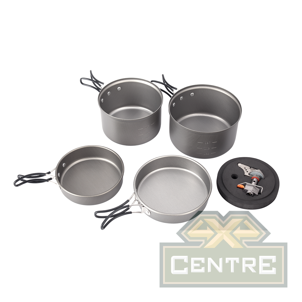 Набор состоит из двух котелков объемом 1,2 и 0,9 литра, двух пиал и складного половника. Крышки котелков могут использоваться как полноценные сковородки.